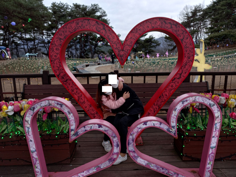 야외에는 다양한 led 꽃들과 조명 그리고 구석기인들의 생활 모습이 만들어져 있어 아이들이 무척이나 좋아하고 사진 촬영하기 좋은 곳입니다.