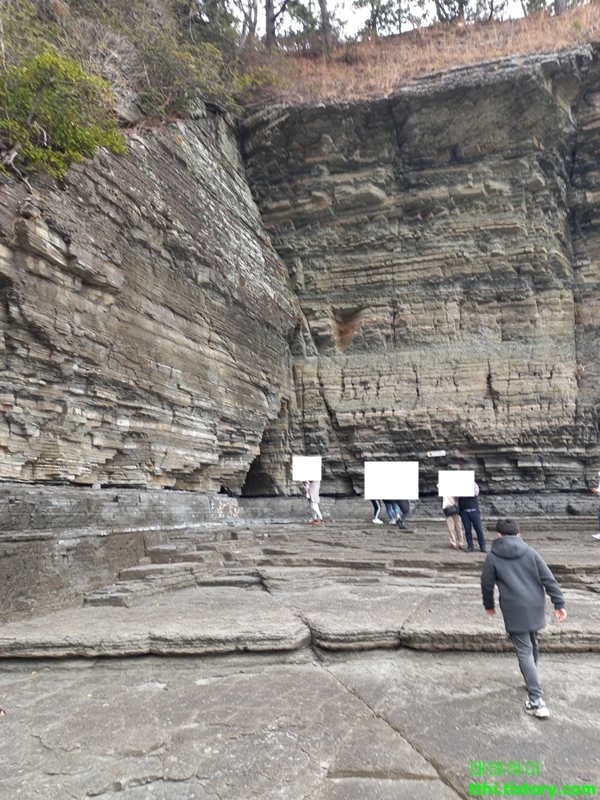"층리" 라고 보이는 자연 경관 뒤쪽이 상족암입니다.