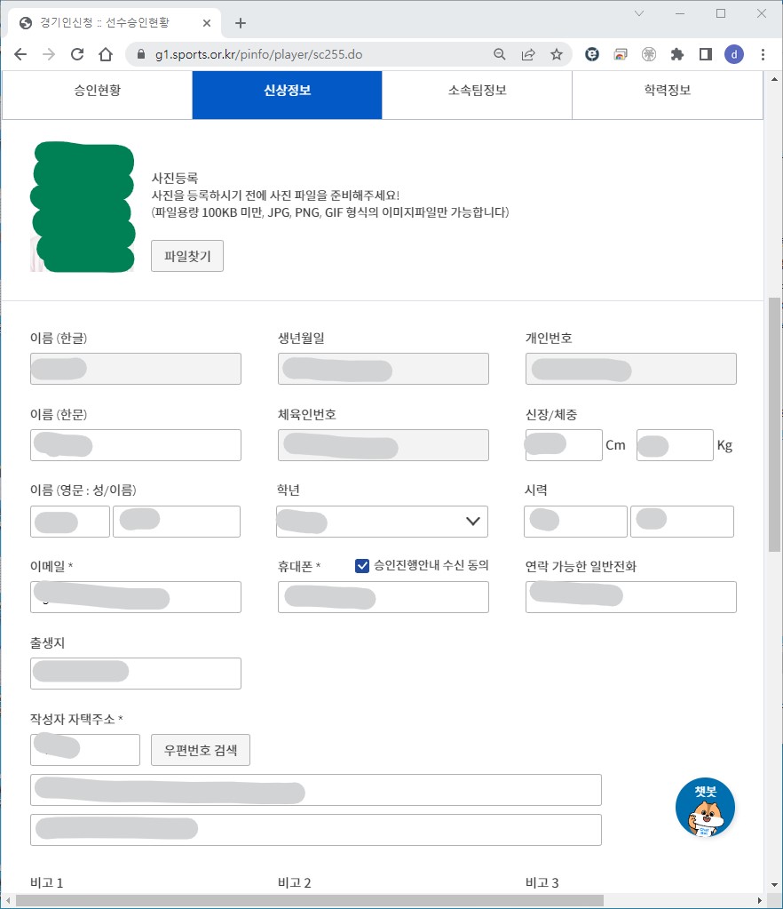 6. 학력 등의 정보는 미리 스포츠포탈 추가정보에 입력한 내용이 그대로 따라옵니다.