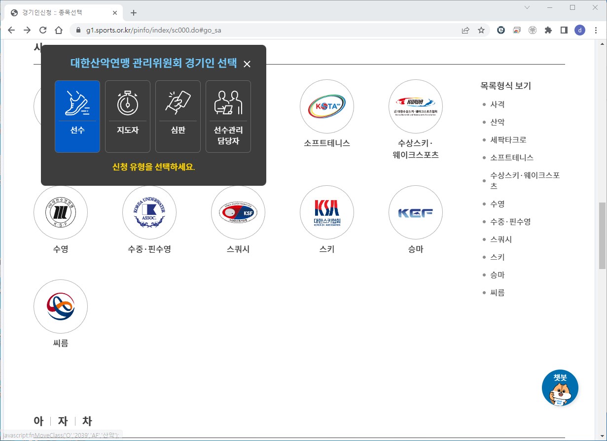 선수유형은 "선수" 로 선택 -> 산악연맹 선수등록 페이지 이동 됨 !!