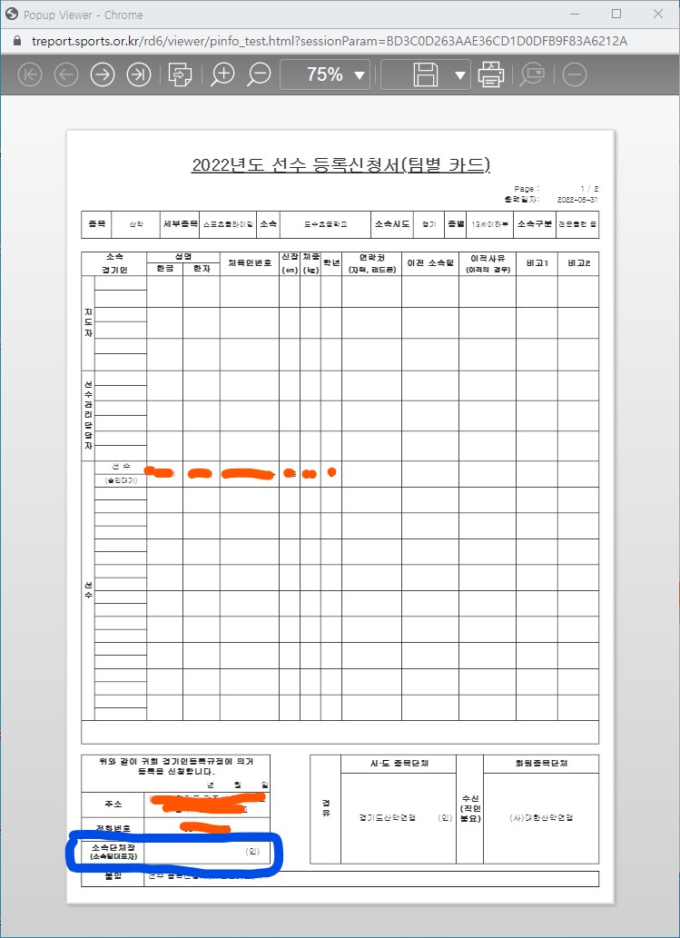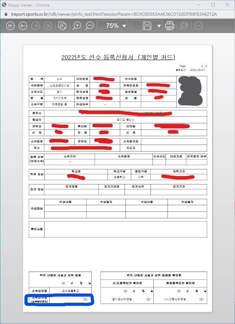 4단계를 완료한 후 학생 선수 등록을 하는 경우 "추가정보수정" 메뉴가 있습니다. 이 정보를 미리 입력하셔야 합니다.