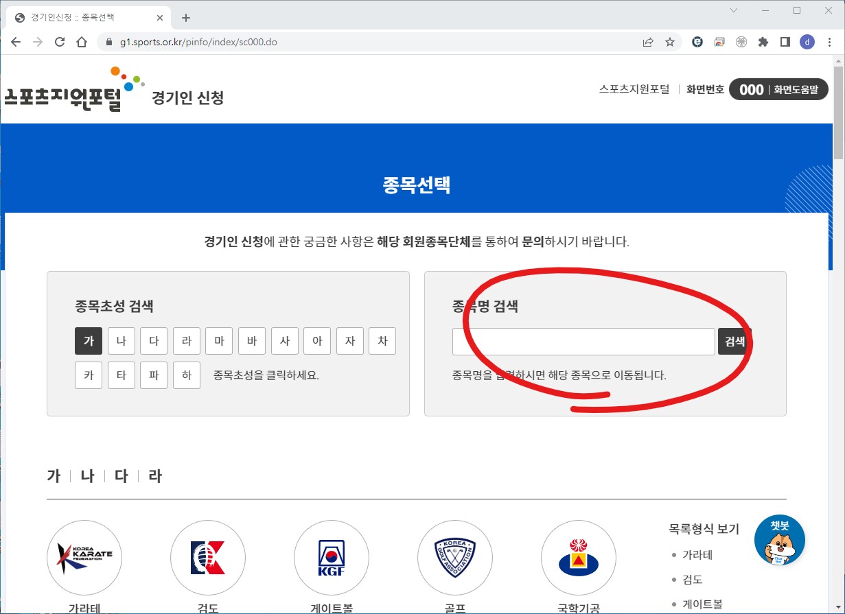 스포치지원포털 메뉴 "경기인등록" 을 클릭합니다.