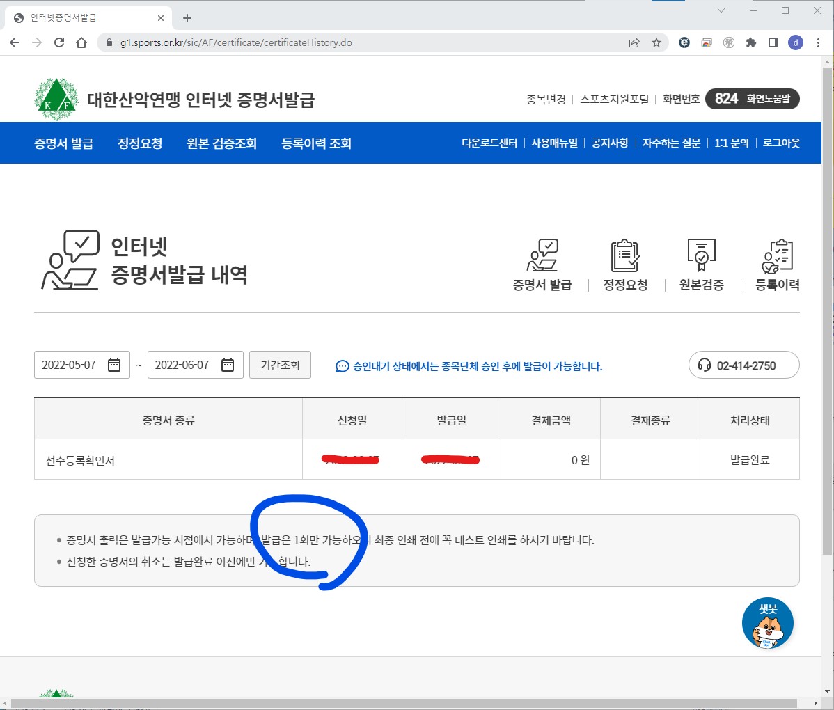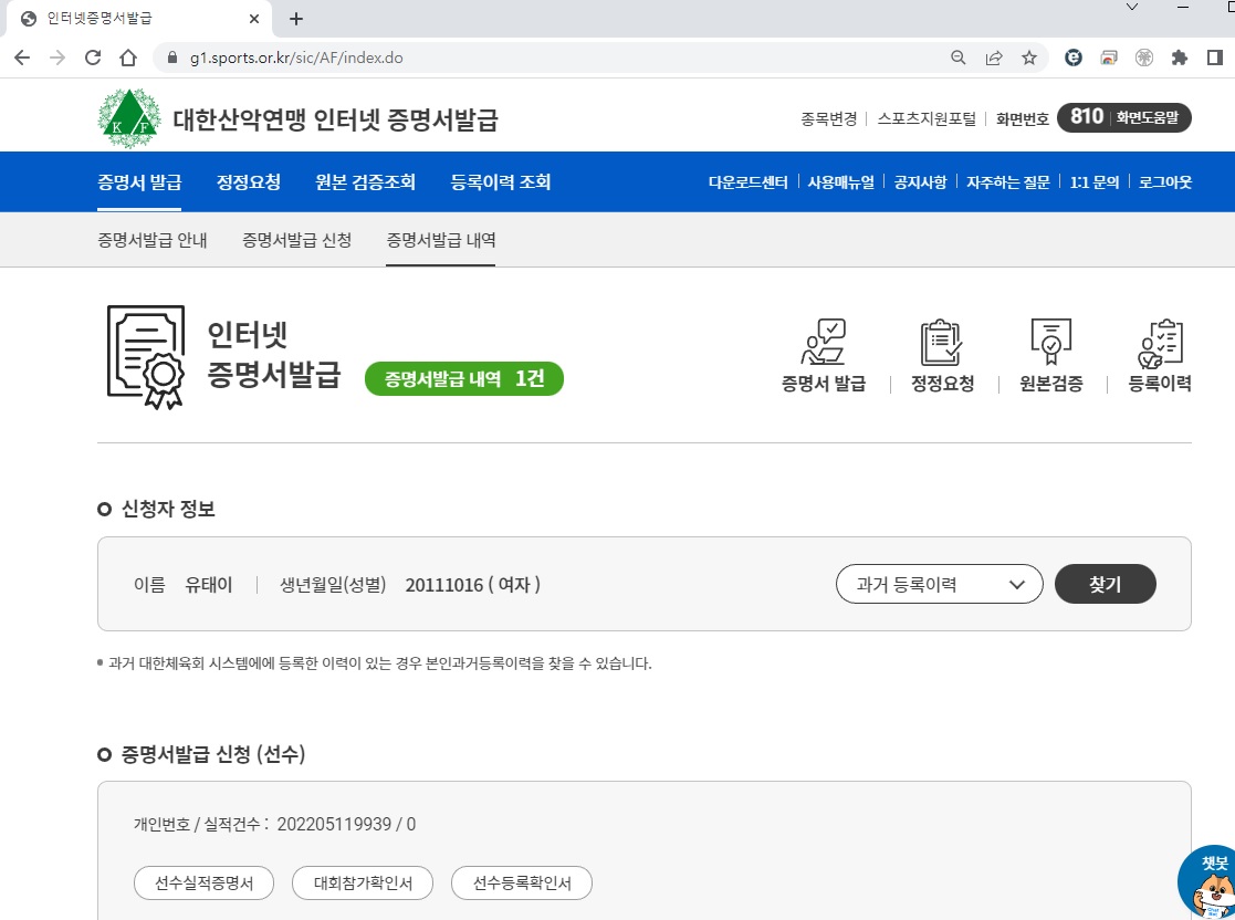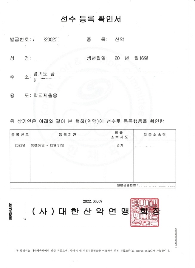 스포츠 클라이밍 대한체육회 증명서 발급은 등록선수이 되어 있어야 합니다.