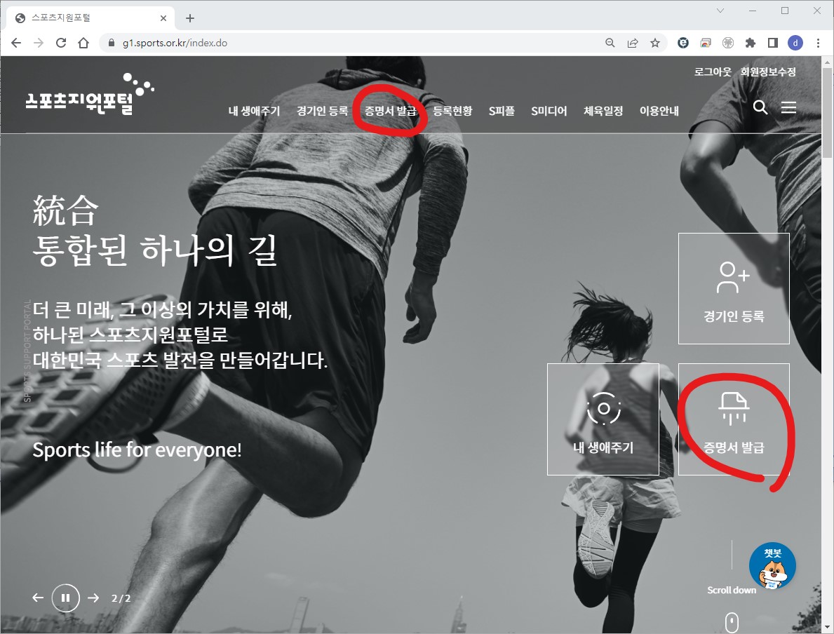 統合통합된 하나의 길 더 큰 미래, 그 이상의 가치를 위해, 하나된 스포츠지원포털로 대한민국 스포츠 발전을 만들어갑니다. Sports life for everyone!